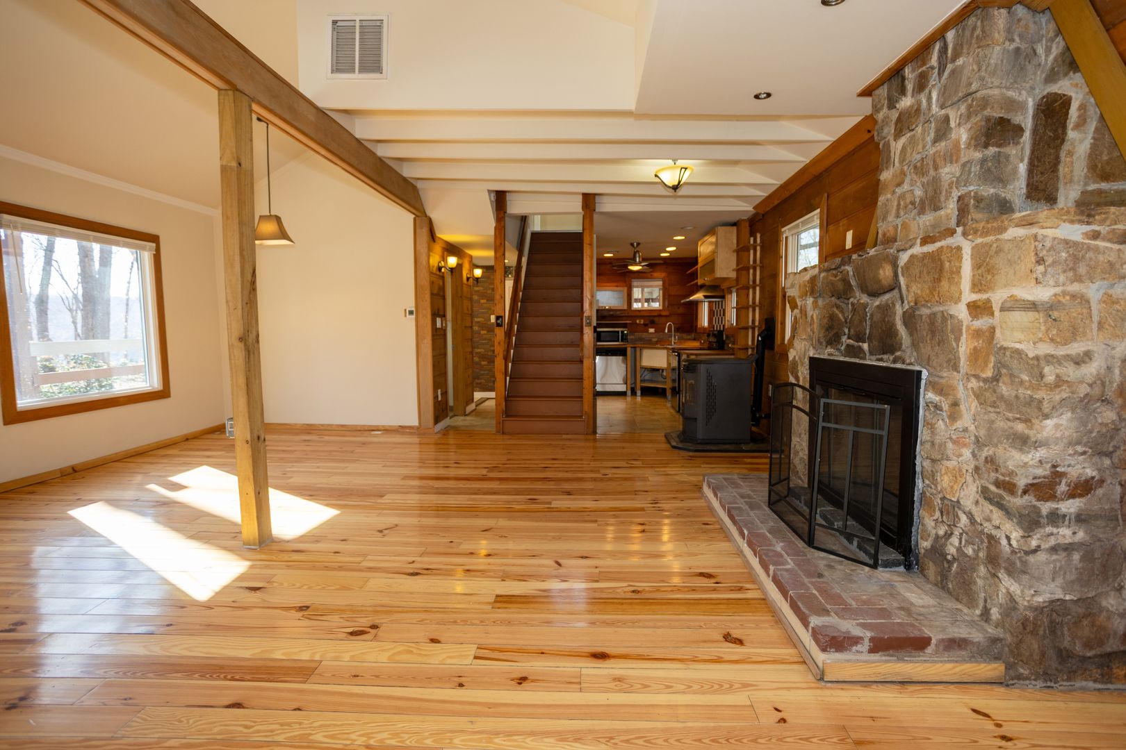 Inside, you’ll find a cozy living area highlighted by a striking stone fireplace, adding timeless charm and a focal point to the home. The traditional layout offers comfortable living with functional spaces, while the two-level design provides separation and flexibility.